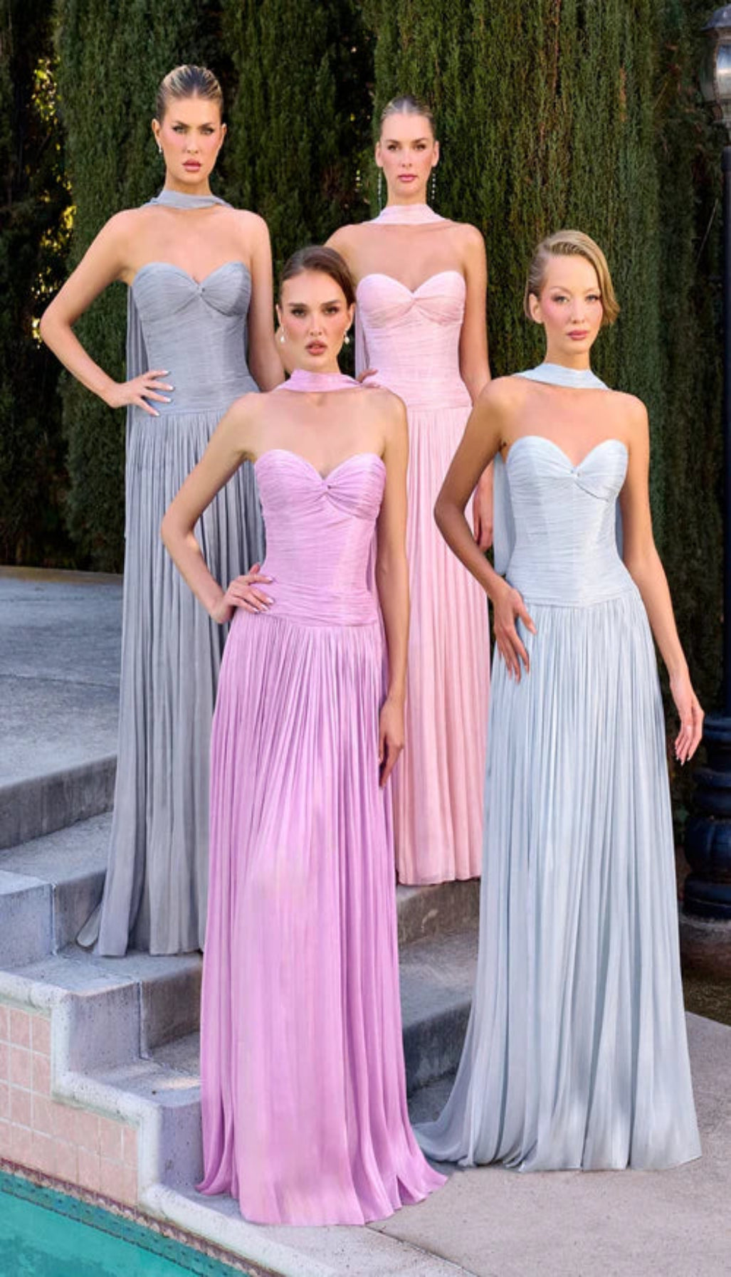 - فساتين شيفون خفيفة ومنسدلة، وفساتين دانتيل رقيقة، وفساتين مخملية غنية.